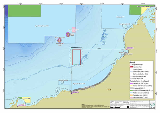 The operational area at its closest is approximately 120 km north of Eighty Mile Beach and 230 km west of Broome. The seismic survey will be undertaken in water depths between approximately 95 m to 172 m.