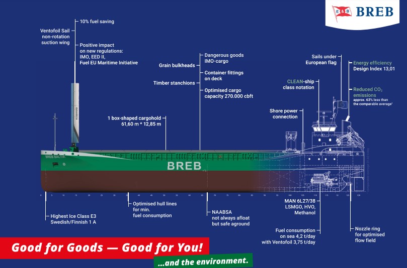German transporation company BREB is preparing to welcome four wind-powered methanol-ready multipurpose dry cargo vessels in 2025.