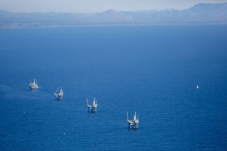 Offshore oil rigs in Southern California; Credit: Drew Bird Photography