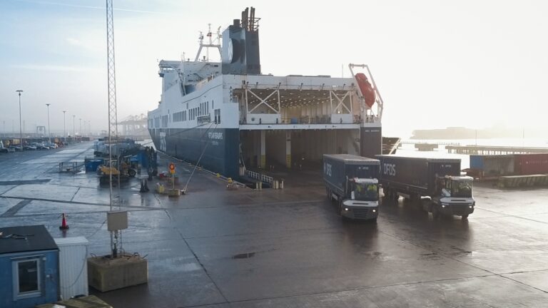 DFDS Truck and Trailer driving onto Ficaria Seawyas in GOT. Courtesy of DFDS.