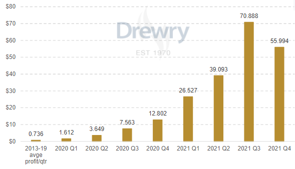 Drewry: Ocean carriers close 2021 with $190 billion profit