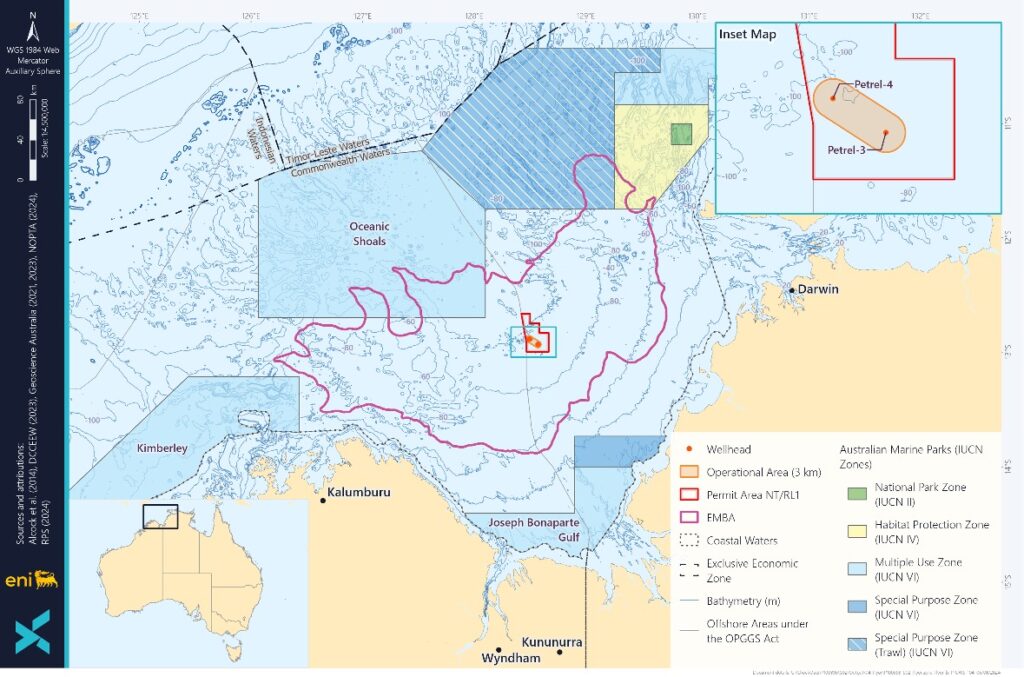 Petrel – the field in question – is located in permits NT/RL1 and WA-6-R. The closest wellhead to the shore is Petrel-3, located in water depths of approximately 95 meters. Together with Petrel-4, the well has been suspended since the 1980s, with wellheads remaining in situ within the NT/RL1 permit.