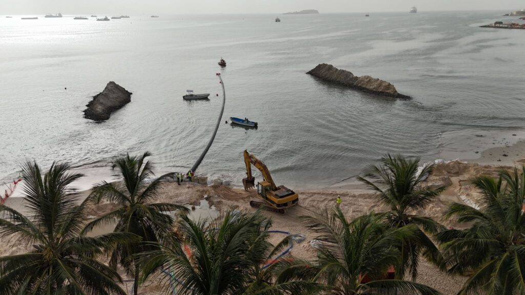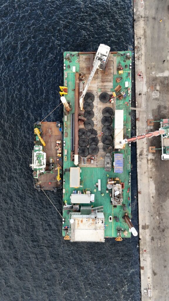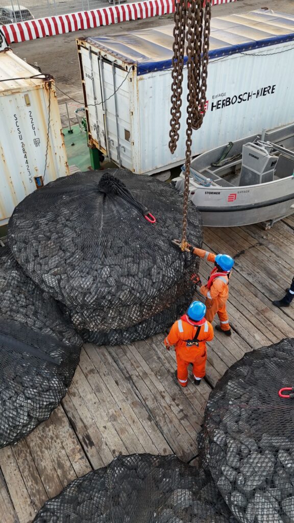 Additionally, the flatbed barge Gaverland loaded 58 rock bags, each weighing 8 tons, which were submerged on the seabed at several key locations, Herbosch-Kiere said.