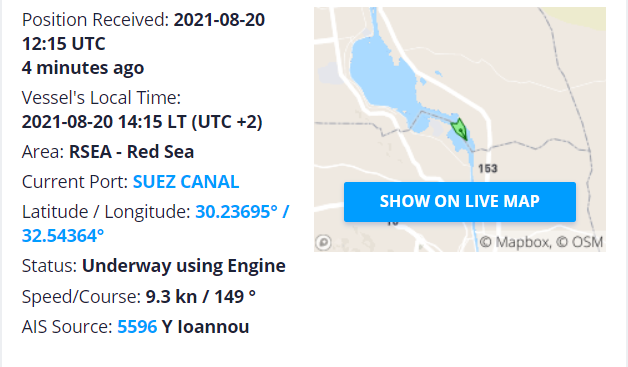 The 20,000 TEU boxship is on its way from Port Said where it arrived on 19 August 2021, at about 7.30 P.M.