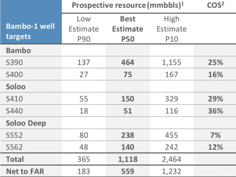 FAR outlined the targets for Bambo (S390 & S400) as two shallower horizons not previously intersected. The target for Soloo (S410 & S440) is the extension of the hydrocarbon-bearing reservoirs in the adjacent Sangomar oil field, offshore Senegal, while Soloo Deep (S552 & S562) is expected to provide two additional horizons, also not previously penetrated with a lower chance of success but higher potential volumes.