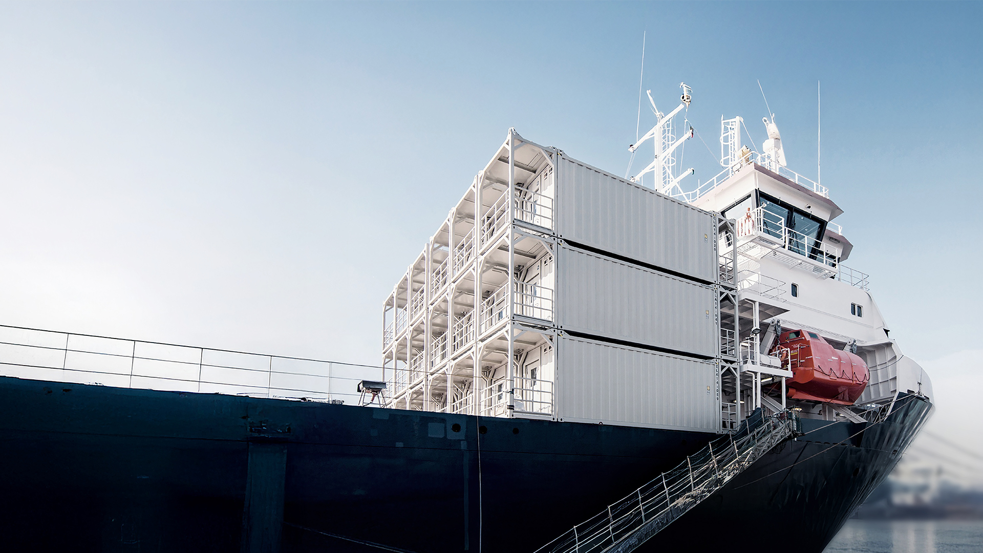 Accessories such as stairs and gangway containers as well as waste water tanks complement the modules to create fully functional facilities. Since the containers can be stacked four high, entire accommodations or office complexes can be realized even on limited deck space.