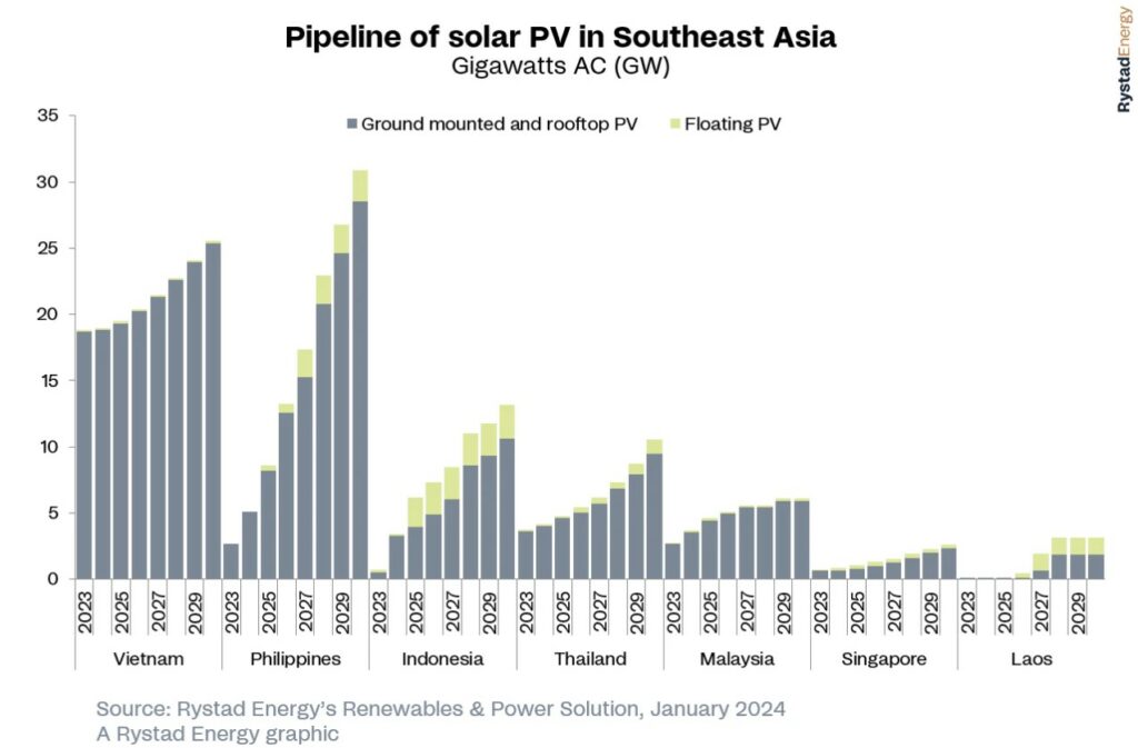 However, addressing land rights is a pivotal challenge for solar developers in Southeast Asia due to the predominant use of available land for agricultural purposes and the region grapples with a scarcity of suitable sites for solar farms. Rystad Energy notes that FPVs have emerged as a viable option, leveraging bodies of water adjacent to agricultural areas – an approach that circumvents land access tensions and presents a potential blueprint for other countries having similar issues.