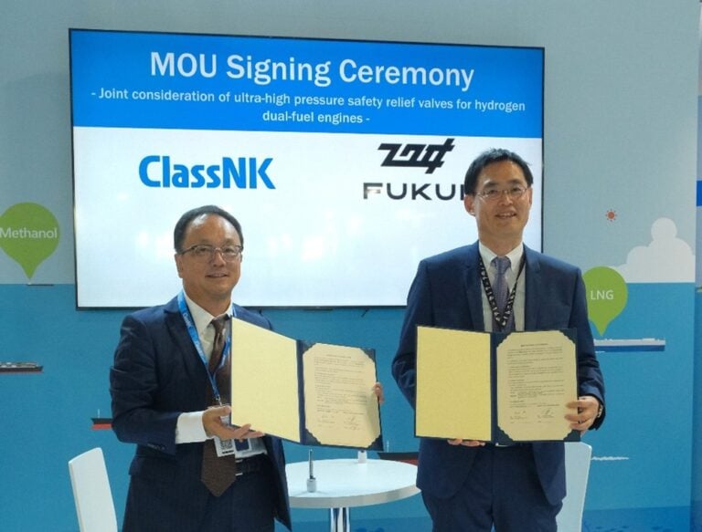 Japan’s manufacturer Fukui Seisakusho and compatriot classification society ClassNK have signed a memorandum of understanding (MoU) to collaborate on ultra-high-pressure safety relief valves for hydrogen dual-fuel engines.