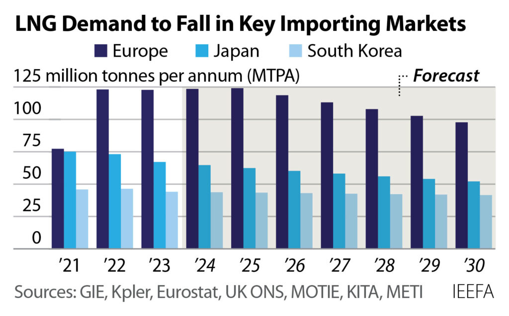 IEEFA’s recent ‘Global LNG Outlook’ points out that sluggish LNG demand growth, in combination with a rise in global export capacity through 2028, has the potential to thrust markets into an extended period of oversupply within two years while major importing regions, including Japan, South Korea, and Europe, which together account for more than half of the world’s LNG imports, are targeting cuts in LNG demand through 2030.