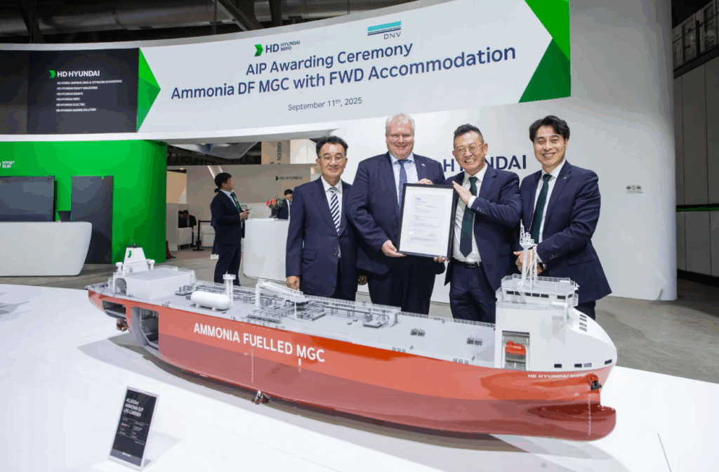 South Korean shipbuilder HD Hyundai Heavy Industries (HHI) has received approval in principle (AiP) from classification society DNV and signed a joint development project (JDP) for AiP with Lloyd’s Register (LR) for its new design of a 15,300 TEU ammonia dual-fuel containership.