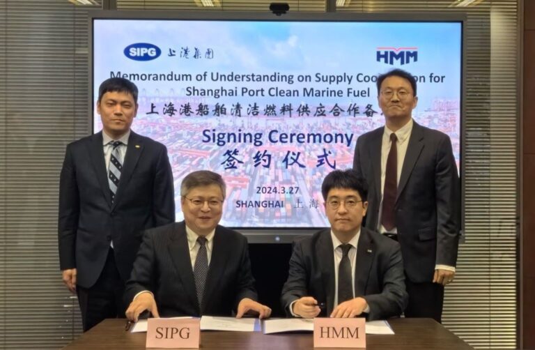 South Korean shipping company HMM and Shanghai International Port Group (SIPG), the exclusive operator of all the public terminals in China’s Port of Shanghai, have inked a memorandum of understanding (MoU) to collaborate on clean marine fuel supply, specifically focused on bunkering methanol and LNG at Shanghai port.