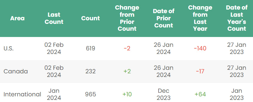 The average Canada rig count for January 2024 was 198 units, up 37 rigs from the prior month’s count of 161 rigs and down by 28 units year-over-year.