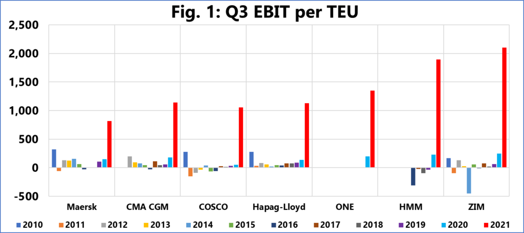 “The absurd nature of the current supply/demand and freight rate environment is clearly evident in figure 1, with the 2021‑Q3 EBIT/TEU figure of each of these shipping lines a clear outlier compared to the historical figures. The smallest EBIT/TEU was recorded by Maersk of 818 USD/TEU, while the remaining carriers all recorded EBIT/TEU of over 1,000 USD/TEU, with ZIM recording an EBIT/TEU of 2,100 USD/TEU,” Sea Intelligence report reveals.