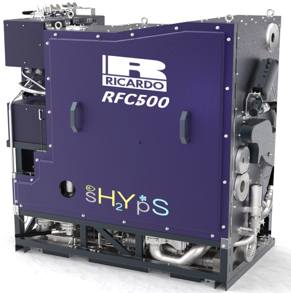 This solution has been designed and developed by Ricardo as part of the Sustainable Hydrogen Powered Shipping (sHYpS) project, which includes the specification, design, build and test of a ~500 kW net, 375 kW gross power fuel cell module (RFC500) and the design of a 40-foot containerized multi-megawatt power plant that combines the outputs of several fuel cell modules.