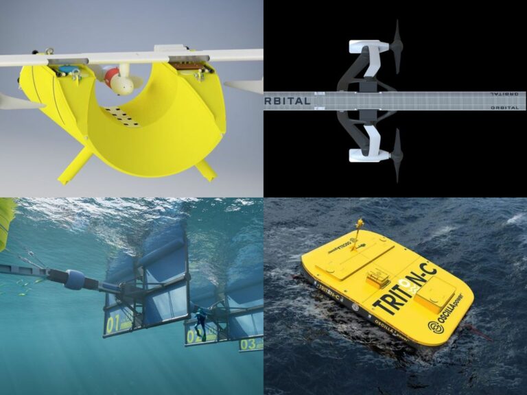 Marine energy technologies by QED Naval; Orbital Marine; Wavepiston; and Oscilla Power (Courtesy of QED Naval; Orbital Marine; Wavepiston; Oscilla Power)