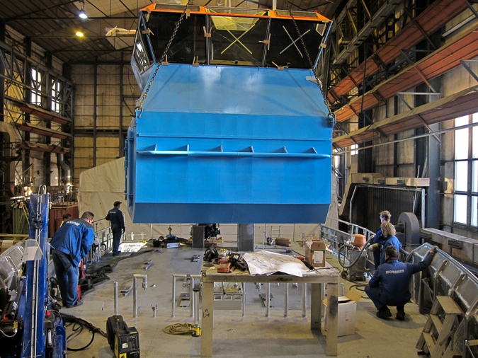 The welding works and the outfitting on the 18m long vessel have progressed in time. On thursday 5th of Jan took therefore place the lift of deckhouse. It was attached on its fixed rubber mounts in the hull later in the same afternoon.