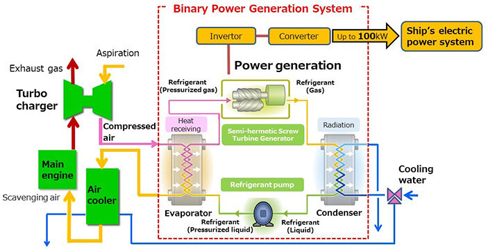 A binary cycle power generation system for ships, jointly researched by Japanese shipping company Mitsui O.S.K. Lines (MOL) and compatriot steel manufacturer Kobe Steel, has been installed on a very large ore carrier (VLOC) newbuild.