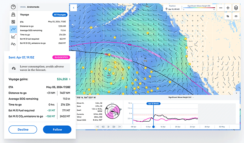 These recommendations use real-time weather forecasts based on information from Sofar’s global network of ocean sensors, the ship’s fuel efficiency calculated using a data-driven model, and market and safety constraints.