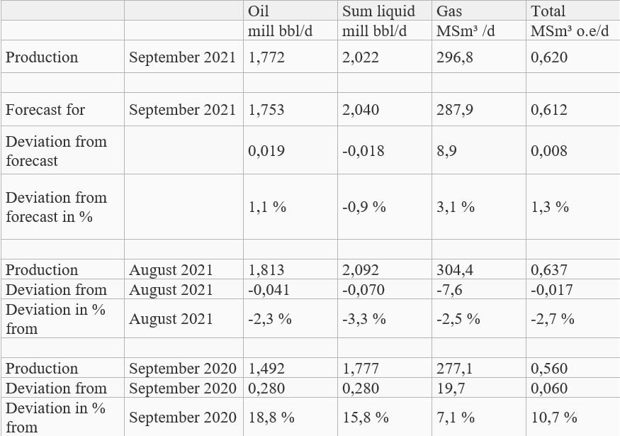 Production figures September 2021; Source: The Norwegian Petroleum Directorate