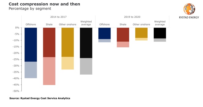 By contrast, the last oil-industry downturn in 2015 and 2016 triggered massive programs to trim unit costs and improve efficiency, resulting in a total cost compression of around 37%. Within shale the cost compression was as much as 45% and for offshore 40%. In addition to this there have also been cost savings due to changes to design, downsizing and currency gains.