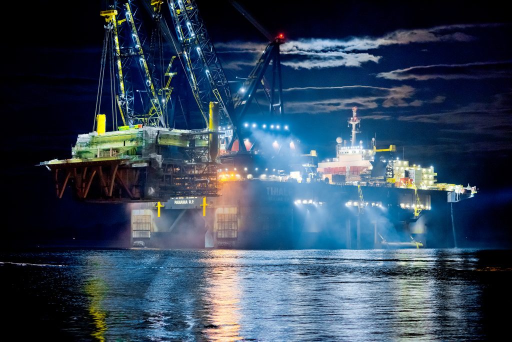 Browsing through Linkedin the other day, I’ve stumbled across a beautiful photo of two heavy lift vessels carrying the giant Aasta Hansteen topside out of the Westcon yard in Ølensvåg, Norway.