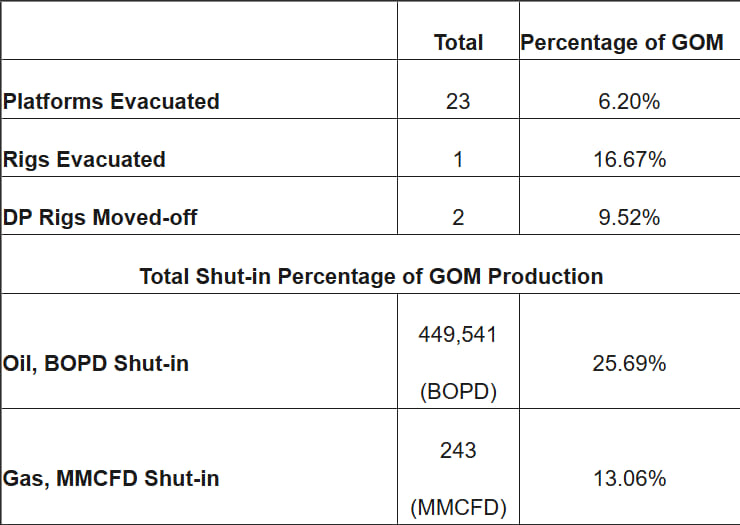 At the time, seven DP rigs moved off location out of the hurricane’s path, as a precaution, representing 33.3% of the 21 DP rigs active in the region. After reviewing operator reports, BSEE estimated that approximately 28.01% and 16.83% of the daily oil and natural gas production, respectively, was shut in.