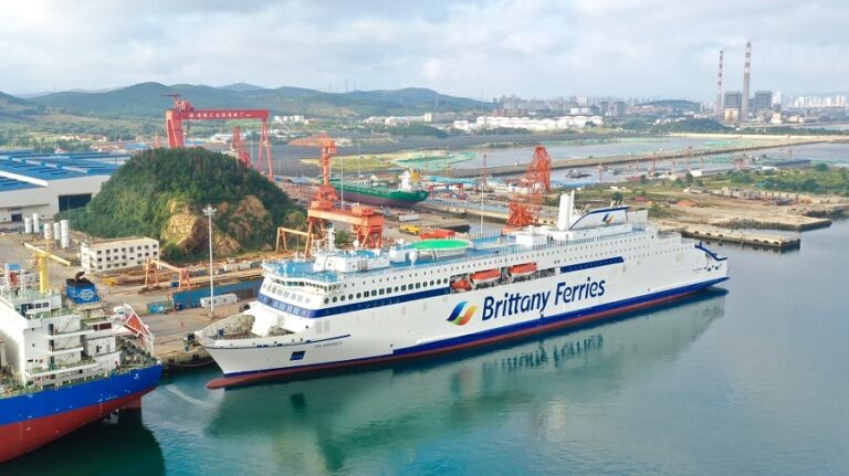 The vessel is Brittany Ferries’ newest E-Flexer cruise ferry Salamanca. It is currently under construction at China Merchants Jinling Shipyard in Shandong.