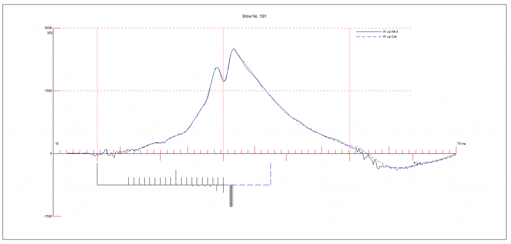 The incident and reflected waves are recorded through the sensors installed at the pile top and analysed, converting the strains into stresses and forces in the pile, while accelerations are integrated into particle velocities and displacements. The downward (incident) wave and the upward (reflected) wave can be isolated from the measured total waves at sensors level, knowing its Force and Velocity components. Pile’s ultimate bearing capacity or soil resistance under continuous driving can be estimated by an inversion process on the recorded reflected wave compared to the incident one. This is commonly known as Signal Matching methodology. The recorded Force and Velocity, integrated over time, are also used to compute the actual hammer energy transferred to the pile, providing information on driving system performance.