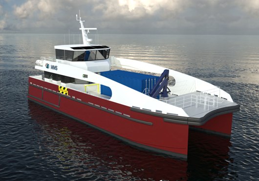 A deck crane is mounted at the forward end of the cargo deck. A passenger cabin at the aft end of the main deck will house 12 technicians, with a galley, wet room, dive stores and bathroom. 4 berths for crew members are located in the in the hulls. The open cargo deck arrangement affords the wheelhouse excellent visibility over cargo handling operations and enhances safety when docked at turbines. Turbine docking is also improved with the fitment of a concave fendering arrangement across the bow.