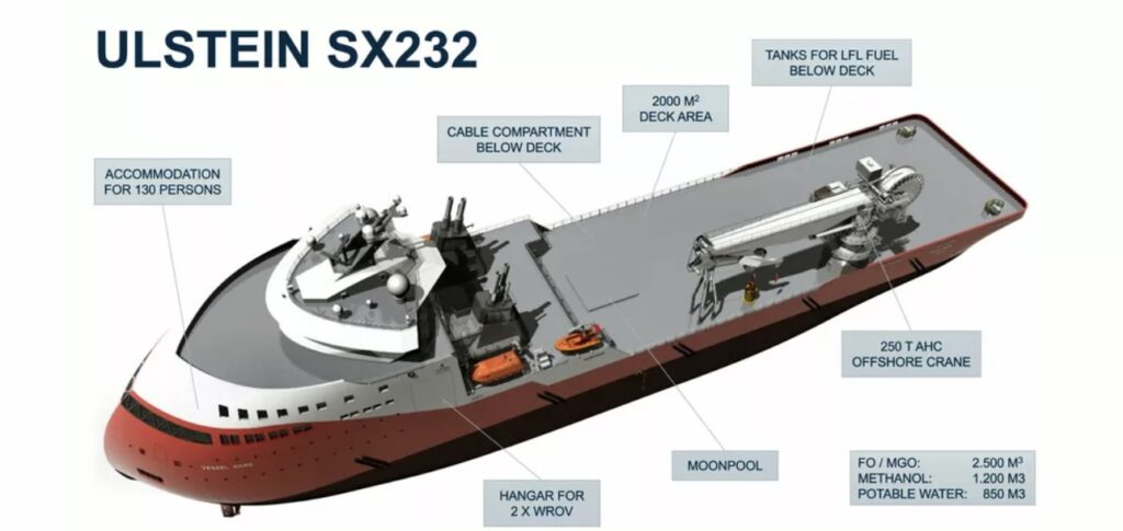Ulstein said that the SX232 is based on three core principles, including an optimized hull design based on the Ulstein Twin X-Stern, a smart power and propulsion system developed to minimize energy consumption during DP operations and an integrated energy recovery system utilizing all the waste heat in the machinery systems (cooling water and exhaust).