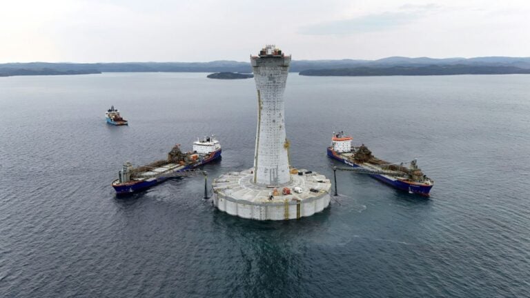 As the CGS, which is 145 meters tall and supports an integrated drilling and production topside, has been positioned on top of the seabed preparation layer that was previously installed, Van Oord deployed its Nordnes flexible fallpipe vessel to install a protective scour edge around it in the third phase of the project to mitigate the effects of seabed erosion.