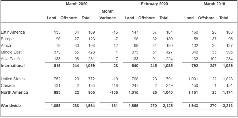 The worldwide rig count for March 2020 was 1,964, down 161 from the 2,125 counted in February 2020, and down 249 from the 2,213 counted in March 2019.